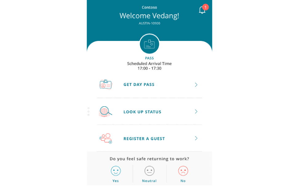 This application is used by employees returning to the workplace – allowing employees to complete a health check and identifying open buildings. Employees are able to be informed and complete return to the workplace procedures through a standardized and consistent process. Once the health check is completed and the employee is eligible to return, they can book a space for the day in open facilities. Terms and conditions give an employee the chance to agree or disagree with set standards. Employees can provide sentiment feedback, bring a guest, and receive relevant facility or action notifications from in-app.