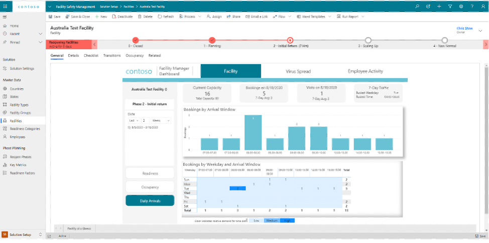 The facility safety management dashboard empowers managers to easily view their building/area’s current phase and facility checklist. Bring consistent and up-to-date knowledge of your organization’s status to managers. This dashboard is customizable to create floors and areas (safe workspaces) to set capacity and limits. As the phases of reopening and transitions continue, a new checklist and process will be available for facility managers. This allows a current view and backlog of employee activity, registrations/visits, and occupancy for a floor/area/building to be analyzed for insights.