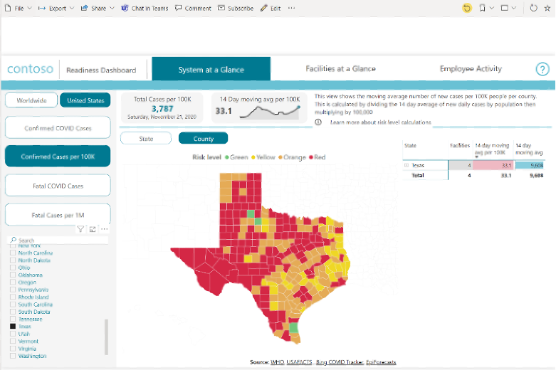 The location readiness dashboard provides decision-makers with key metrics and visualization for the return-to-work process. View the map to display facility locations, along with correlating statistics surround COVID such as confirmed cases, confirmed cases per 100K, fatal cases, and fatal cases per 1M. Additionally, view details such as opening readiness and occupancy rates across facilities, as well as employee and guest sentiment by date.