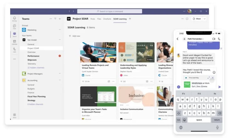 Creating a centralized learning portal for employees helps educate them using content libraries. Filled with information on subjects they need to know, employees can then share and discuss with their colleagues for increased engagement. For on-the-job learning, employees have access to new skills and content right inside of Teams.