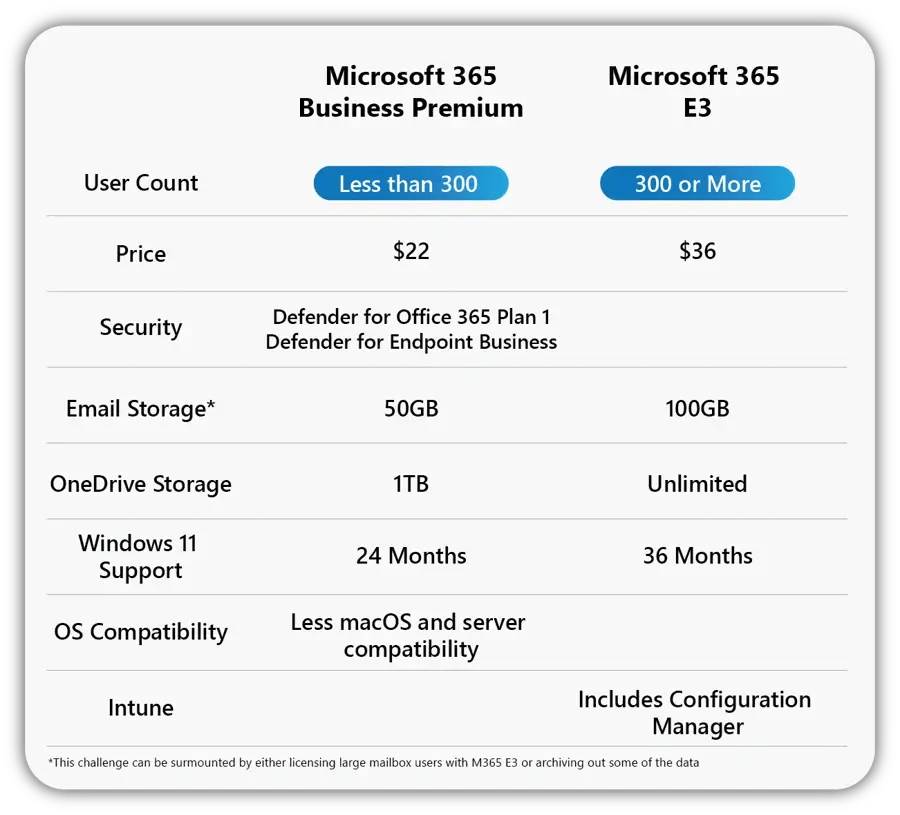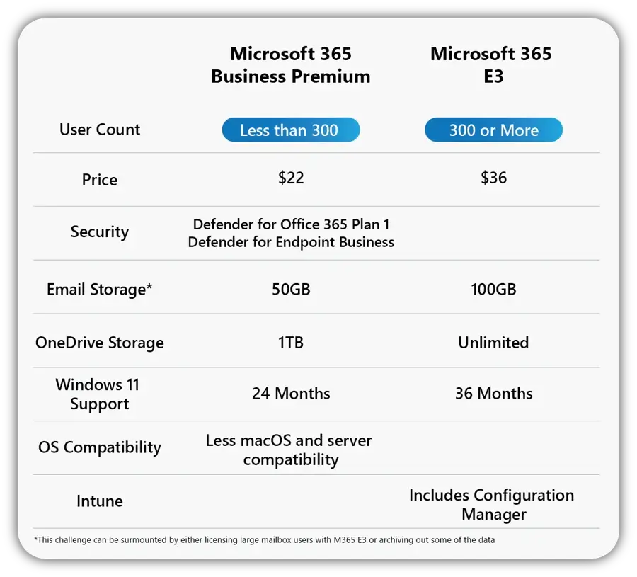 If your organization has fewer than 300 users and requires a comprehensive productivity suite with built-in security and device management features, Business Premium is likely the better option. However, if you have more than 300 users or anticipate rapid growth, E3 may be a better fit.