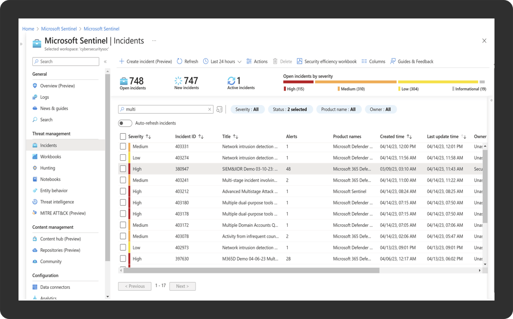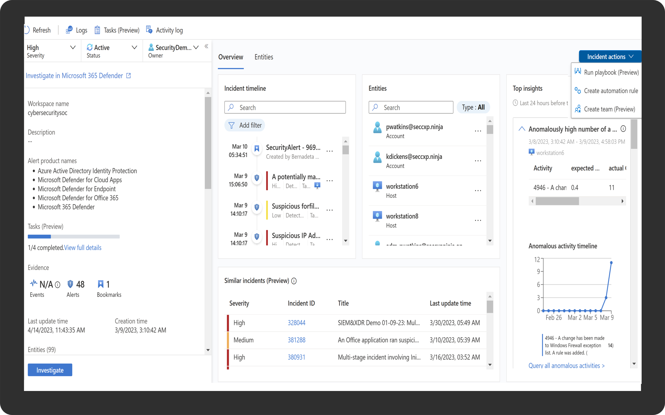 - Benefit from enhanced user and entity behavior analytics (UEBA), security orchestration, automation, and response (SOAR), hunting capabilities and threat intelligence (TI) built into your day-to-day operations workflow to expedite investigation and response