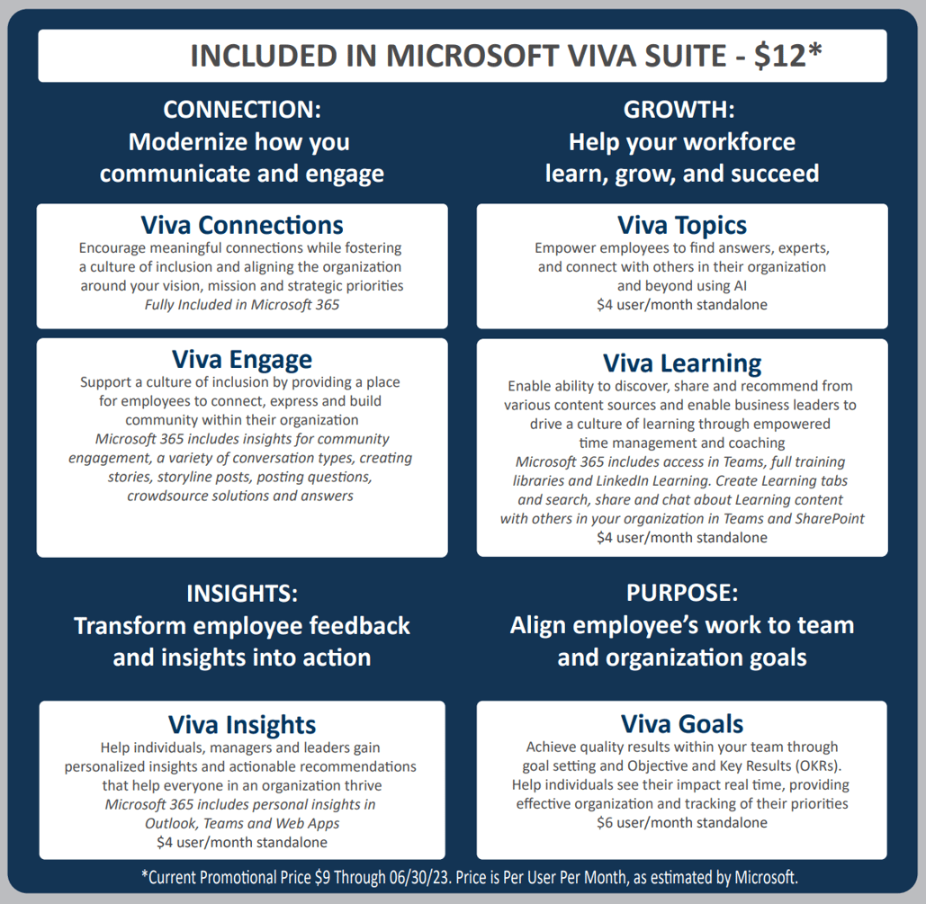 Microsoft Viva brings together communications, knowledge, learning, resources, and insights into an integrated experience that empowers people and teams to be their best from anywhere. Powered by the full breadth and depth of Microsoft 365, Viva is experienced through Microsoft Teams and other Microsoft 365 apps that people use every day. Viva fosters a culture where people and teams are empowered to be their best from anywhere.