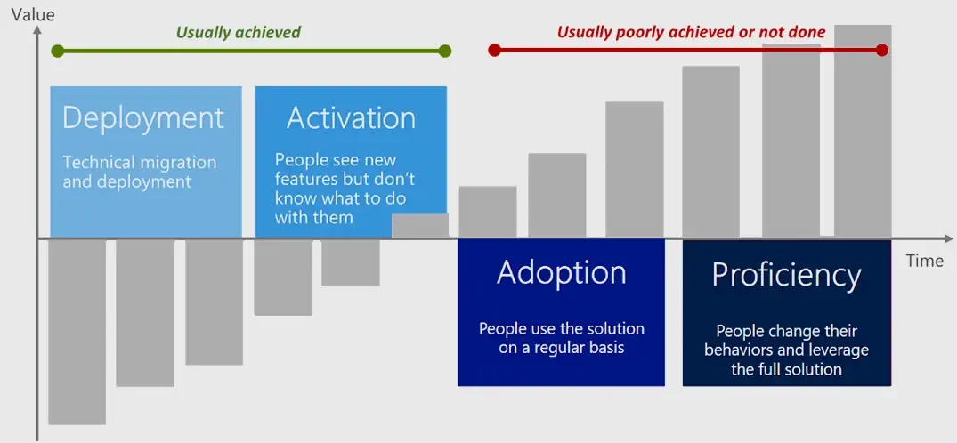 Why is this so important? The way technology is deployed often leaves a lot to be desired. It can be difficult for employees to adopt new technology when roll-out plans are only technical in nature, information about the new tool isn’t disseminated properly, or the technology is simply dumped on staff without further explanation – when employees don’t understand new technology or why it is being imposed, they tend to reject it. Often, employees have been using the same tools for years and have their own habits and processes. Creating desire through adoption training and planning can help your employees to really understand how these new technologies can help them in their daily workday and make things easier – therefore, your organization can make the most out of its investment.