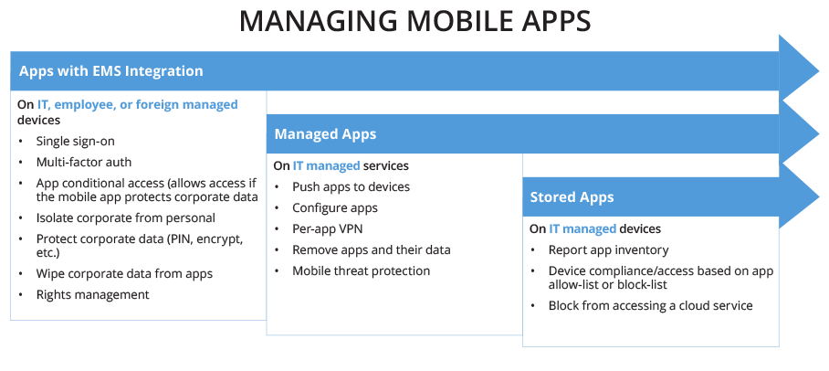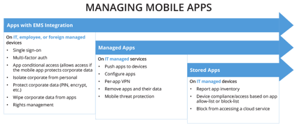 When using Intune with the other EMS services, your organization’s mobile app security will be above and beyond what is provided by the mobile operating system and the mobile apps themselves. An app that is managed with EMS has access to a broader set of mobile app and data protection capabilities that includes: