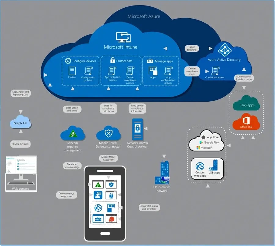 Intune device management works by using the protocols or APIs (application program interface) that are available in the mobile operating systems. Intune integrates with Azure AD to enable a broad set of access control scenarios.
